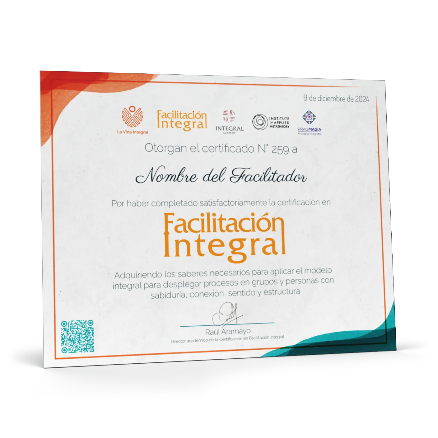 Recibirás una Certificación Internacional en Facilitación Integral, otorgada por La Vida Integral y respaldada por el Instituto de Metateoría Aplicada y la Academia Integral Europea.